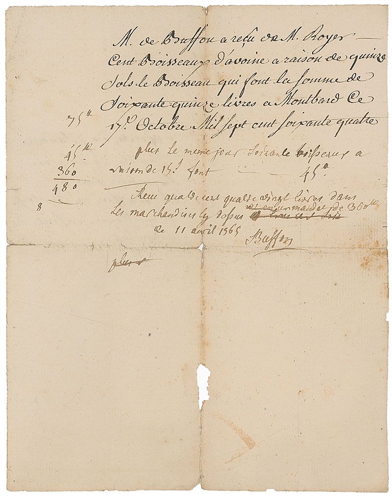 French naturalist, mathematician, and author (1707–1788). Five-line handwritten endorsement, in French, signed “Buffon,” dated April 11, 1765, Montbard, at the conclusion of a manuscript document, also in French, one page, 6 x 8. A receipt for wheat for his farm. For over forty years, Buffon famously cared for his large estate in his native town of Montbard. In very good condition, with central horizontal and vertical folds, some paper loss along central vertical fold, and scattered toning.