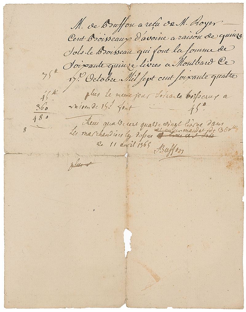 French naturalist, mathematician, and author (1707–1788). Five-line handwritten endorsement, in French, signed “Buffon,” dated April 11, 1765, Montbard, at the conclusion of a manuscript document, also in French, one page, 6 x 8. A receipt for wheat for his farm. For over forty years, Buffon famously cared for his large estate in his native town of Montbard. In very good condition, with central horizontal and vertical folds, some paper loss along central vertical fold, and scattered toning.