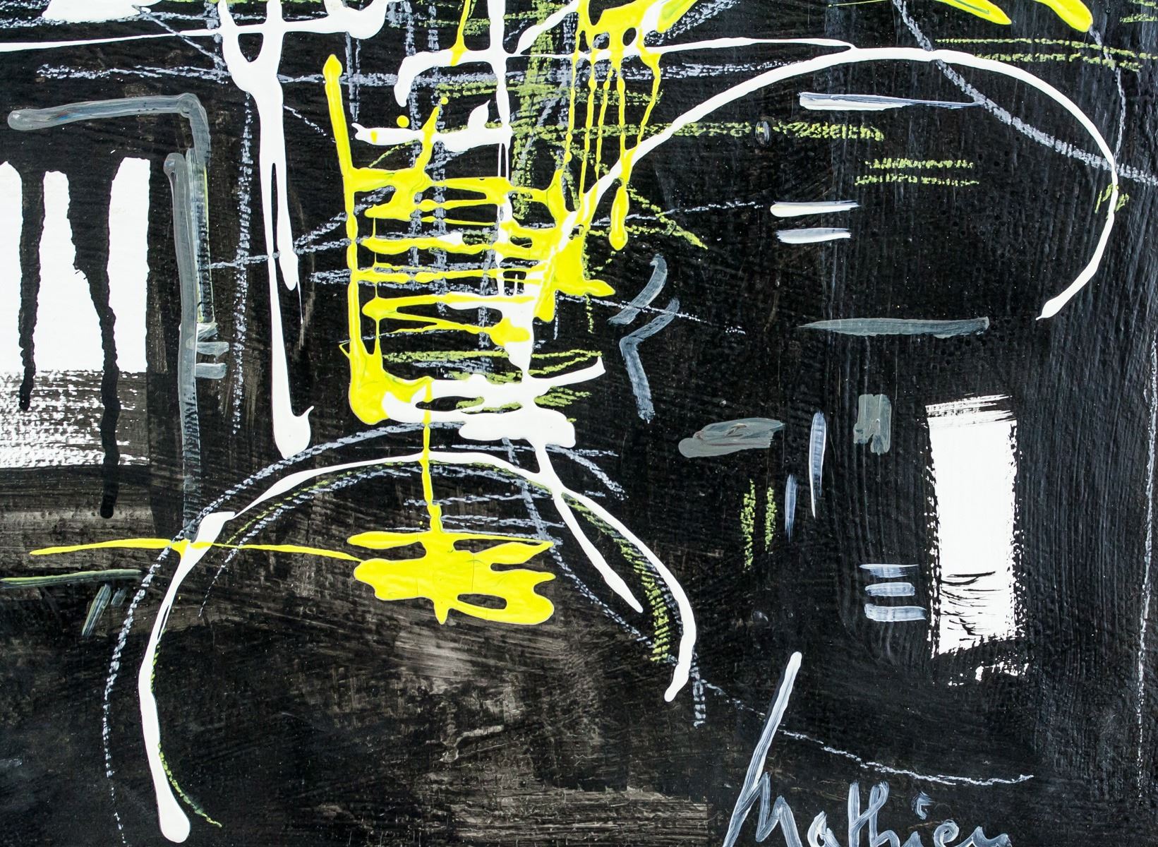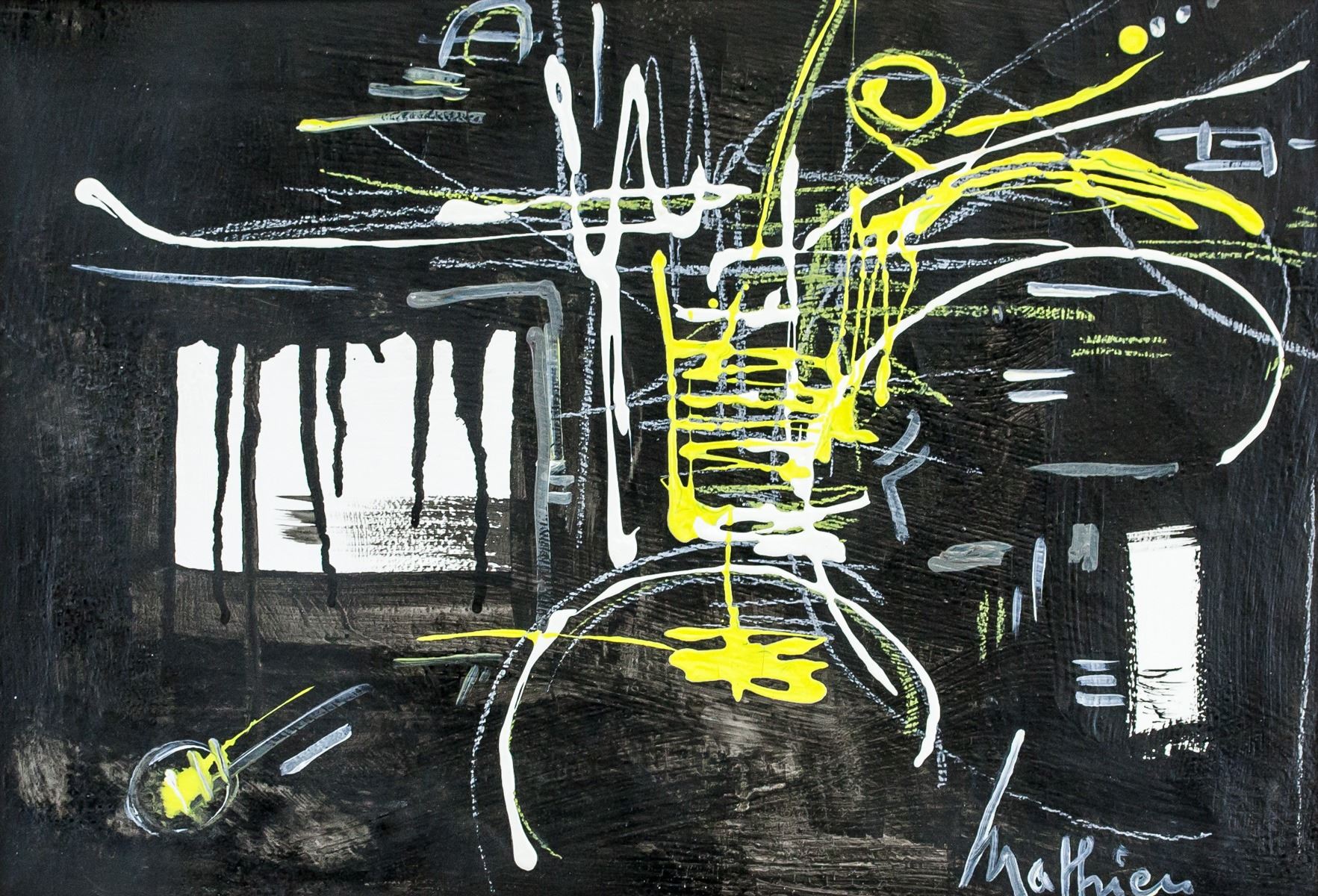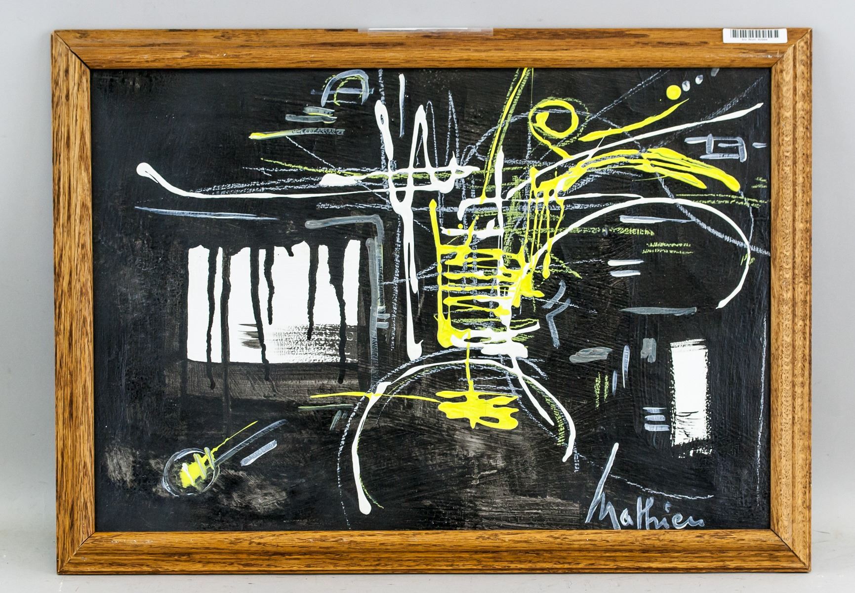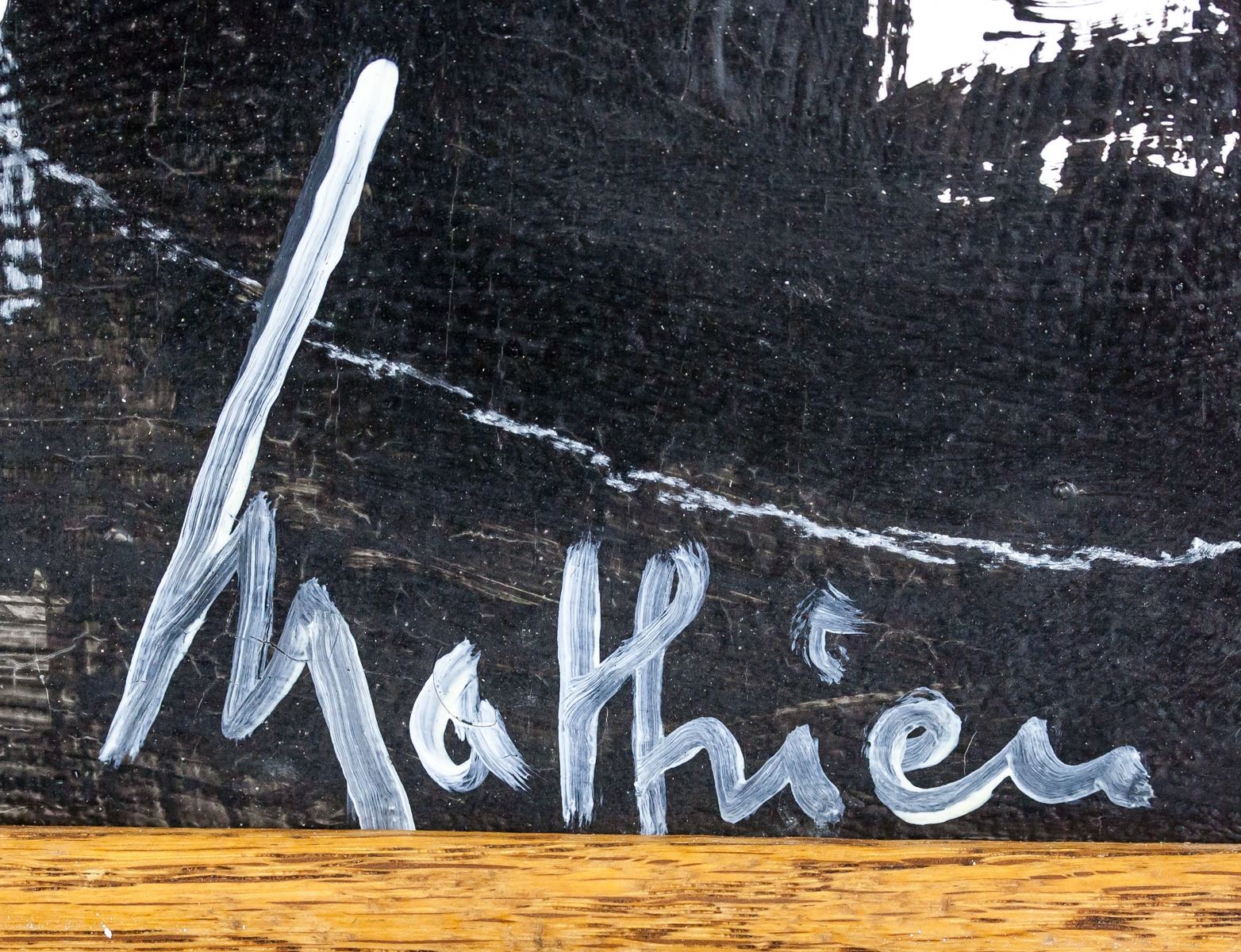 Oil on canvas, framed. Featuring lyrical abstract composition. Signed Mathieu on the lower right corner. Attributed to Georges Mathieu (1921-2012, French). 33 x 48.5 cm (13.0 x 19.1 inches). Frame size: 38 x 53.5 cm (14.9 x 21.1 inches). PROVENANCE: Southern Ontario estate