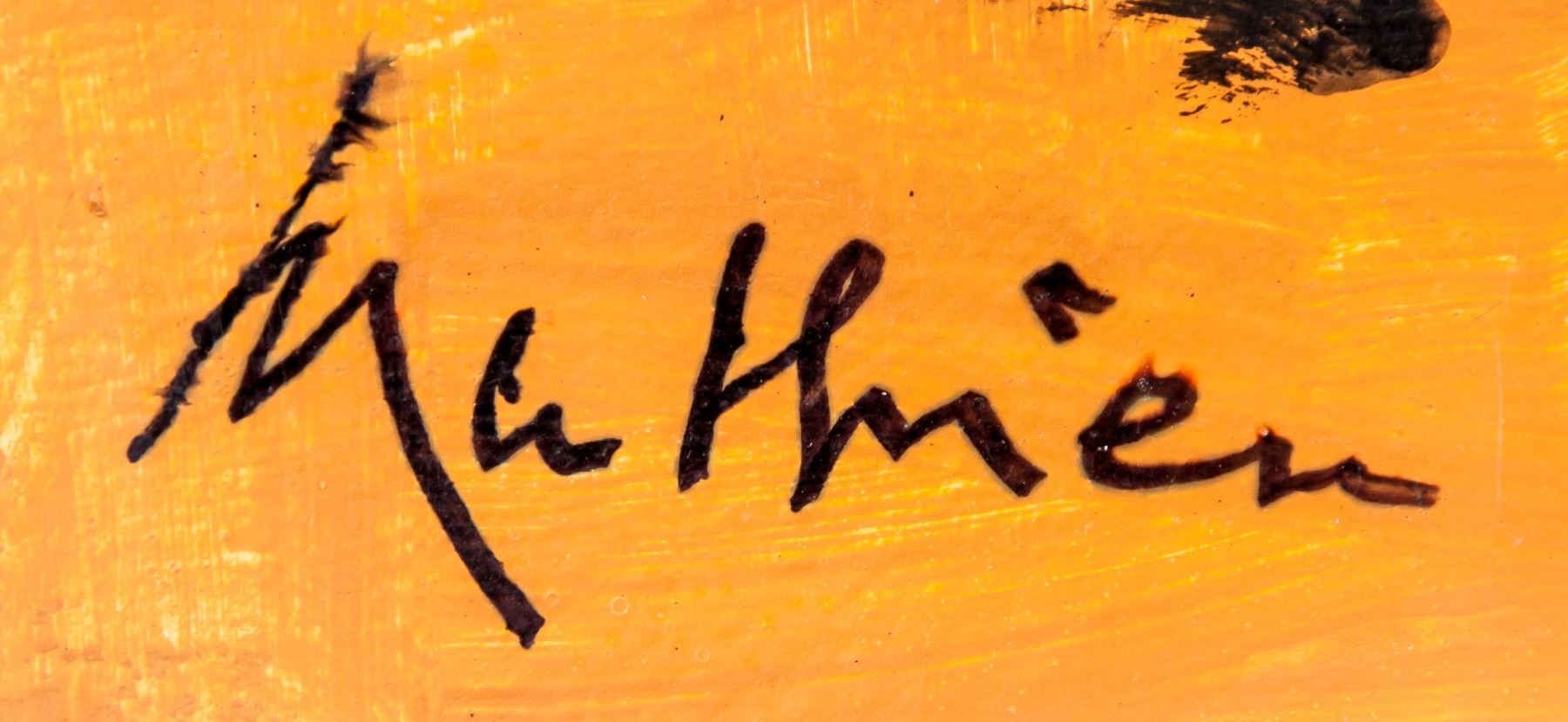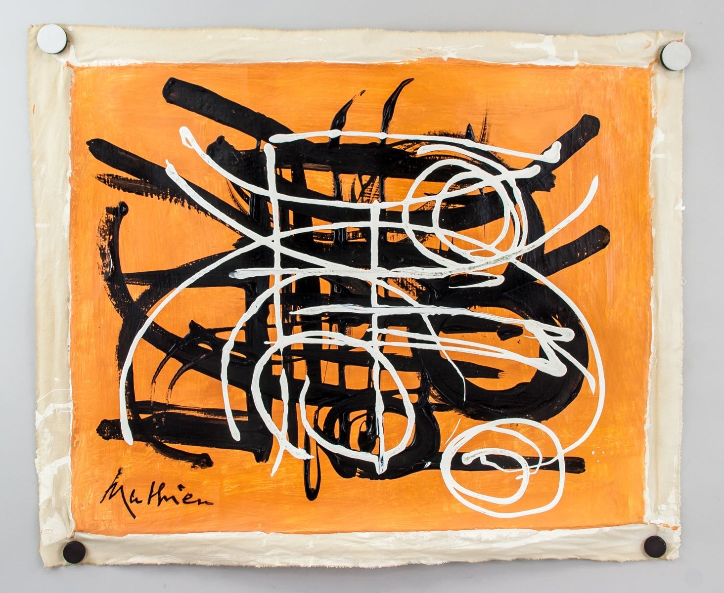 Oil on canvas, unstretched. Featuring abstract composition. Signed Mathieu on the lower left corner. Attributed to Georges Mathieu (1921-2012, French). 41 x 51 cm (16.1 x 20.1 inches). PROVENANCE: This lot carries limited provenance from an Upper New York estate