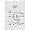 French abstract painter (1921–2012) considered one of the fathers of European lyrical abstraction. Original abstract ink sketch accomplished by Mathieu on a white 6 x 4 card, signed and inscribed in the lower right, "Mathieu, to Tim O'Flynn, 92," with a maroon felt swatch affixed at the bottom. Also includes an ALS signed "Mathieu," two pages, 8.25 x 11.75, personal letterhead, November 1992, in full: "If you would like further information on my work do not hesitate to let me know." In fine condition. Accompanied by the original mailing envelope.