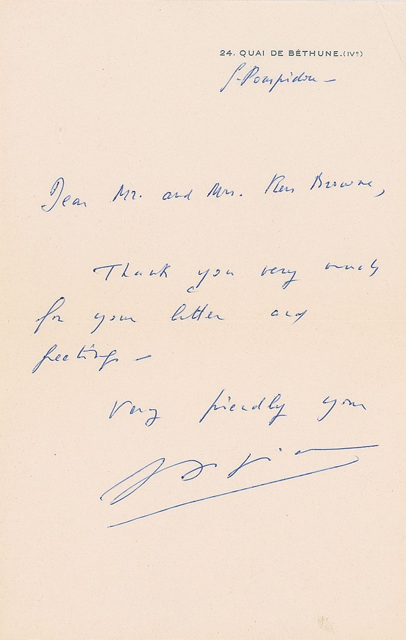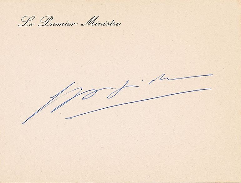 French politician (born 1911) who served as President of France from 1969 until his death in 1974. He previously was Prime Minister of France from 1962 to 1968—the longest tenure in the position's history. Two items: a circa 1965 ballpoint signature of Georges Pompidou on an off-white 5 x 3.75 card printed along the top "Le Premier Ministre"; and an ALS, one page, 5.25 x 8.25, postmarked August 2, 1968, in full: "Thank you very much for your letter and feelings." Pompidou signs at the bottom and incorporates his name into the upper right address field. In overall fine condition. Accompanied by two original mailing envelopes.