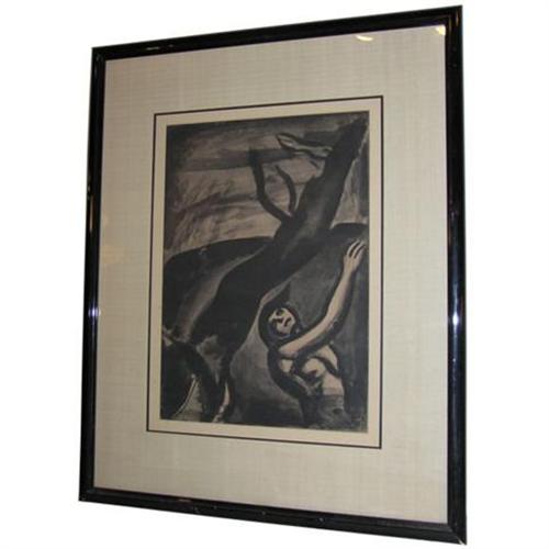 This is an original aquatint and engraving from Miserere by Georges Rouault, entitled "Demain sera beau, disait lenauf ragé" ("Tomorrow will be beautiful, said the shipwrecked man"). From the original edition of 450, printed by Jacquemin of Paris on heavy laid paper with Arches and Ambroise Vollard watermarks, and published in 1948 by La Société d'Edition l' Etoile Filante of Paris. Signed and dated (1922) in the plate. Sheet measures approximately 50 cm by 65 cm and printed area measures approximately 43 cm by 58 cm. This print was recently framed by our client, and we were not able to inspect and photograph it prior to framing. Frame has some nicks and scratches but is in otherwise very good condition. Frame measures 25.5 by 31.5 by 1 inch, and the portion of the print exposed under matte measures 13.75 by 19.5 inches. Print appears to be in excellent condition. It is flat and shows no signs of foxing or fading.