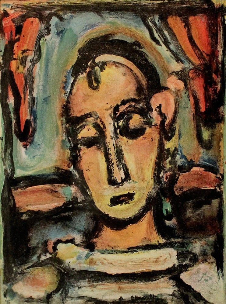 Rouault, Georges. Tete. Original color lithograph printed by Mourlot, Signed in the plate, 1939. Double matted and framed in a new moulding. Sheet 10 1/4 x 14 inches, framed c. 18 x 22 inches. Comes with a Certificate of Authenticity.