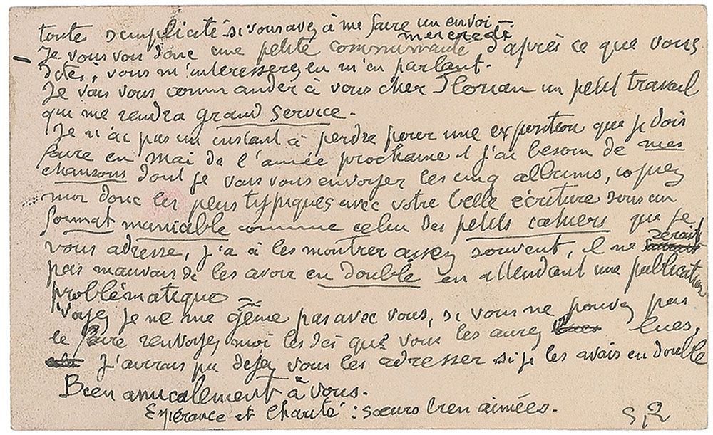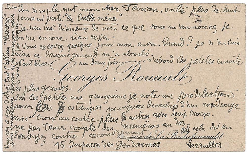 French Fauvist and Expressionist painter, and printmaker in lithography and etching (1871–1958). ALS in French, signed “G. R.,” on both sides of one of his 4 x 2.25 personal visiting cards, no date. Letter to a friend and fellow artist, “my dear Florian,” in part (translated): “It has been more than eight days since ‘the mother-in-law’ left. I would like very much to see what you announce to me, I have received nothing yet. You will receive what I sent in a few days. When? I don’t know about it this move kept me absorbed. May be in two times… first the small ones, then the bigger ones. On the small one about fifteen I note my liking for 8 prints marked with a red circle behind, with cross in the center plus 6 others with two crosses. Disregard numbers in the back. Send collect yes this is being said in all simplicity if you have to send me something—For what you tell me I see that you are a small community. I would be interested to hear about it. I am going to ask a small job of you, dear Florian, which will be of great help to me. I have no time to spare because of an exhibition I must do next year in May and I need my songs of which I am going to send you the five albums, then copy the most typical ones in your nice handwriting in a format easy to handle, same as the small notebooks that I am sending you, I have to show them rather often, it would not be bad to have a duplicate while awaiting a problematic publication. You see, I am at ease with you, if you cannot do it send them back as soon as you have read them, I could have had sent them to you already would I have had duplicate.” In the margin, Rouault has also written, “You have to dedicate all the ‘Miserere’ album to yourself, and my best song if at least my heart did not deceive me.” In fine condition. Rouault’s Miserere series, commissioned by his agent, the Parisian dealer Ambrose Vollard, began as a proposed two-volume book set in collaboration with poet Andre Suares. Unhappy with Vollard’s treatment of Rouault, Suares withdrew from the project and the series was never completed; it was not until 1948 that fifty-eight of the prints were finally published. A remarkable handwritten letter from the masterful French artist, with notable reference to his famous Miserere series.