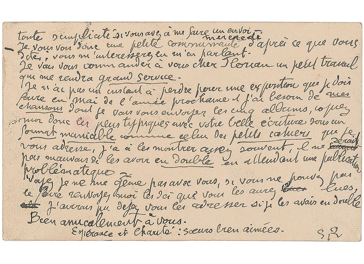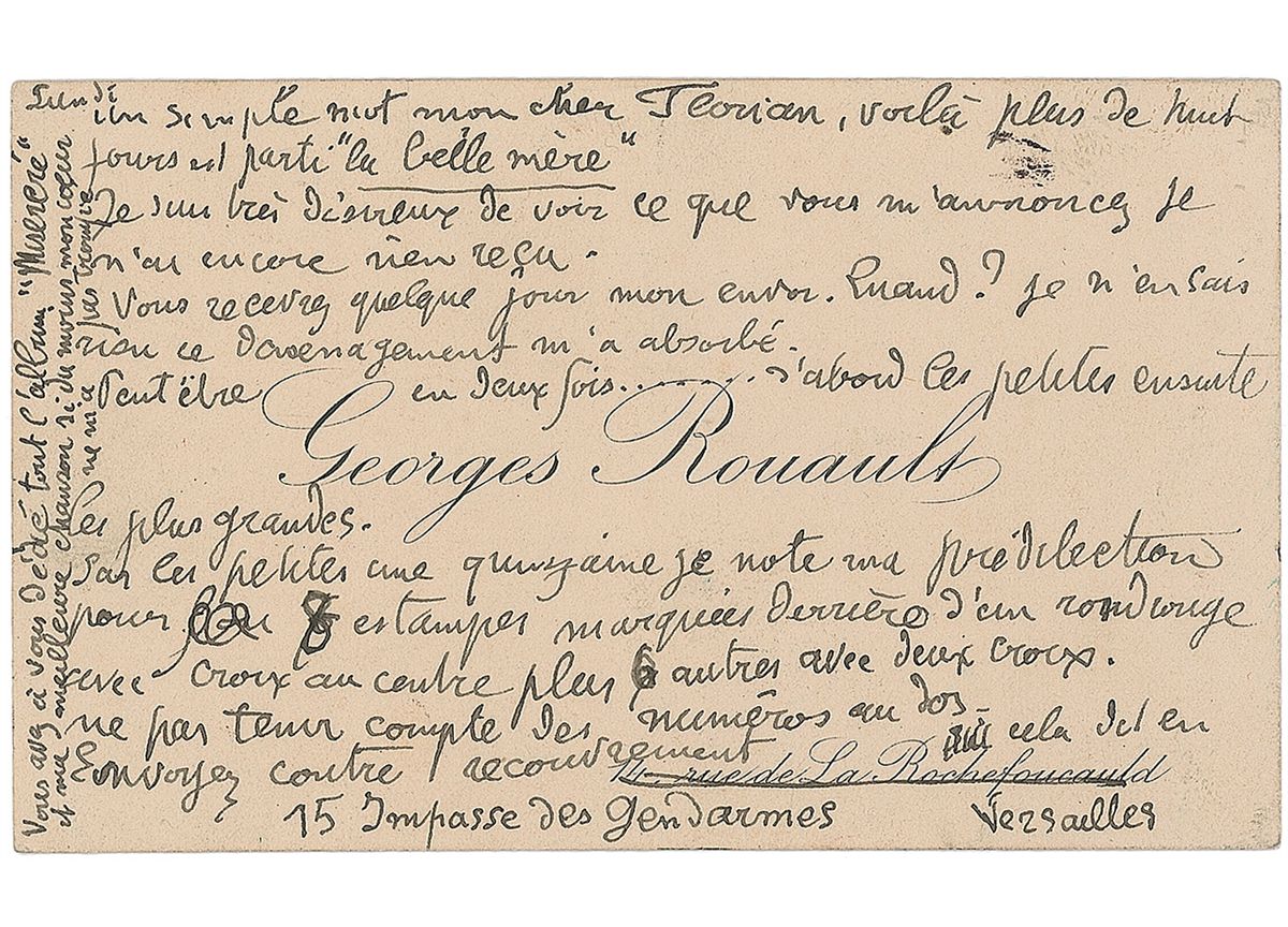 French Fauvist and Expressionist painter, and printmaker in lithography and etching (1871–1958). Rouault’s personal calling card printed with his name in the center, 4 x 2.5, with a lengthy untranslated ALS in French penned on both sides, signed at the conclusion in black ink using his initials, “G. R.” In fine condition.