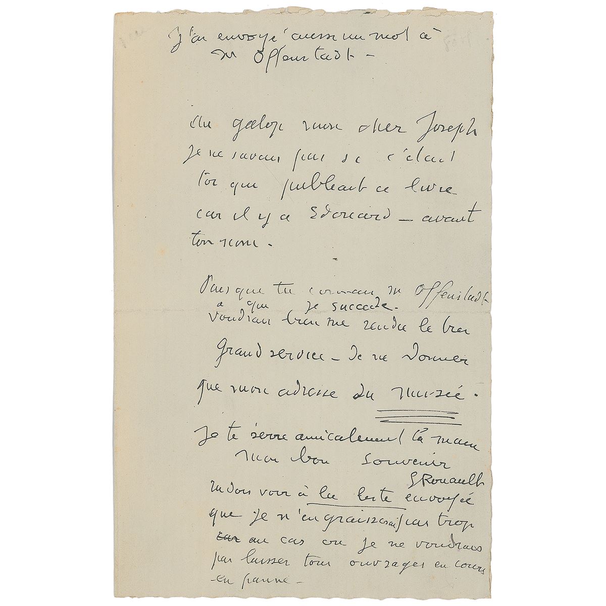 French Fauvist and Expressionist painter, and printmaker in lithography and etching (1871–1958). Crisply penned ALS in French, signed “G. Rouault,” one page, 5.25 x 8.25, no date. Untranslated letter regarding a recently published book. In fine condition.