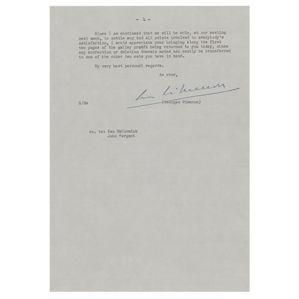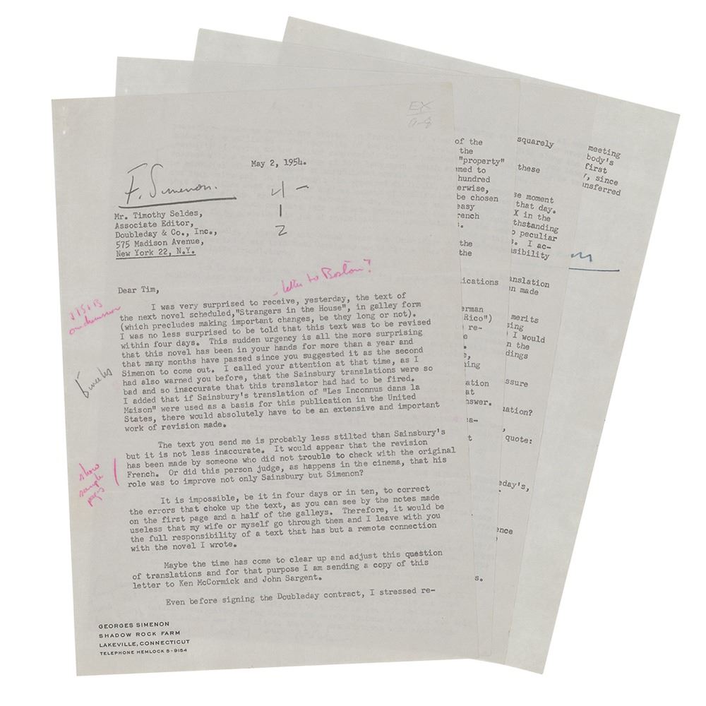 Two TLSs from Georges Simenon, both addressed to his editor at Doubleday & Company. The first, four pages, May 2, 1954, written to Timothy Seldes, concerns the difficulties of getting suitable English translations made of his numerous books: “It would appear that the revision has been made by someone who did not trouble to check with the original French. Or did this person judge, as happens in the cinema, that his role was to improve not only Sainsbury [the original translator] but also Simenon.†He goes on to plead for an editor who reads French, stating that it seems “to me essential since the number of unpublished novels exceeds a hundred and they exist only in the French.†Of a recent meeting with his editors, Simenon says: “May I tell you that both of you had the mien of hatchet menâ€; the letter bears several editorial notes. The second, shorter TLS, one page, June 15, 1970, written to Elen E. Krieger: “This will acknowledge receipt of your note dated June 12th enclosing my copy of the reversion of rights for eleven of my books published by Doubleday at the time.†In overall fine condition.