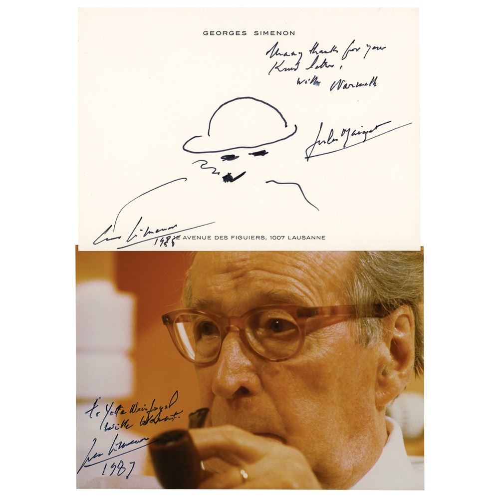 Belgian author (1903-1989) best known for his Inspector Maigret detective novels. Two items: an original felt tip sketch by Georges Simenon of his popular sleuth, Detective Jules Maigret, with trademark pipe, bowler hat, and thick overcoat, accomplished on a white 5.75 x 4 personal correspondence card, signed and dated at the bottom by Simenon; and a color glossy 6 x 4 close-up photo of the author smoking his pipe, signed and inscribed in black felt tip. In very fine condition. Accompanied by the original mailing envelope for the sketch.