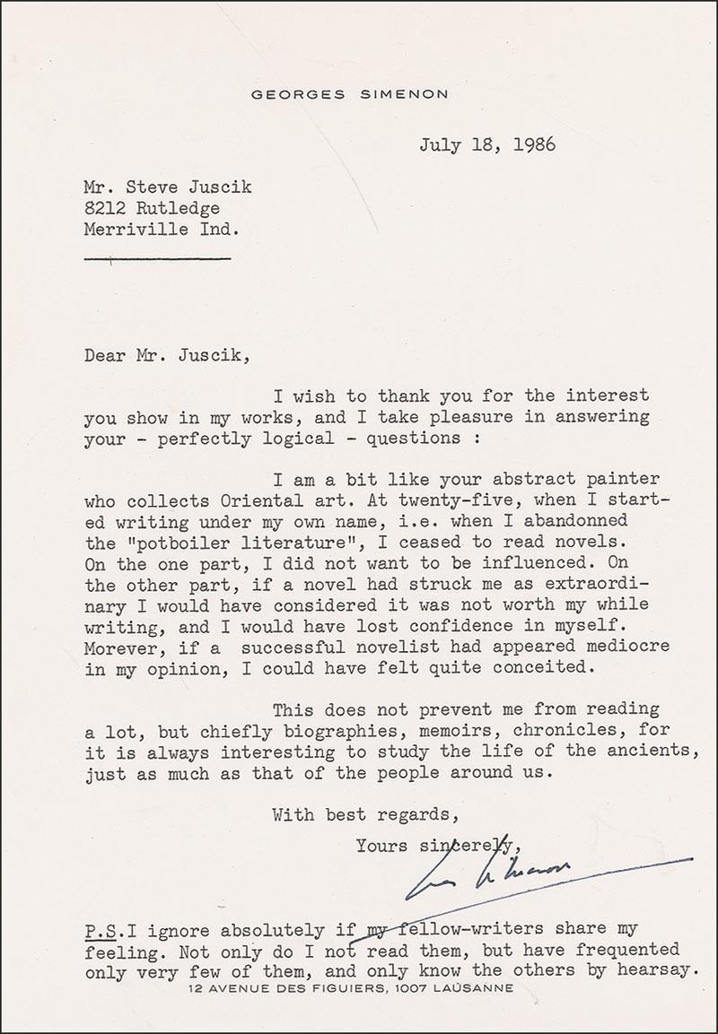 TLS, one page, 5.75 x 8.25, personal letterhead, July 18, 1986. Simenon writes Steve Juscik of Indiana. In part: “I wish to thank you for the interest you show in my works, and I take pleasure in answering your—perfectly logical—questions. I am a bit like your abstract painter who collects Oriental art…when I abandoned the ‘potboiler literature,’ I ceased to read novels. In the one part, I did not want to be influenced. In the other part, if a novel had struck me as extraordinary I would have considered it was not worth my while writing, and I would have lost confidence in myself. Moreover, if a successful novelist had appeared mediocre in my opinion, I could have felt quite conceited.” In fine condition. Great insight into the author’s mind.