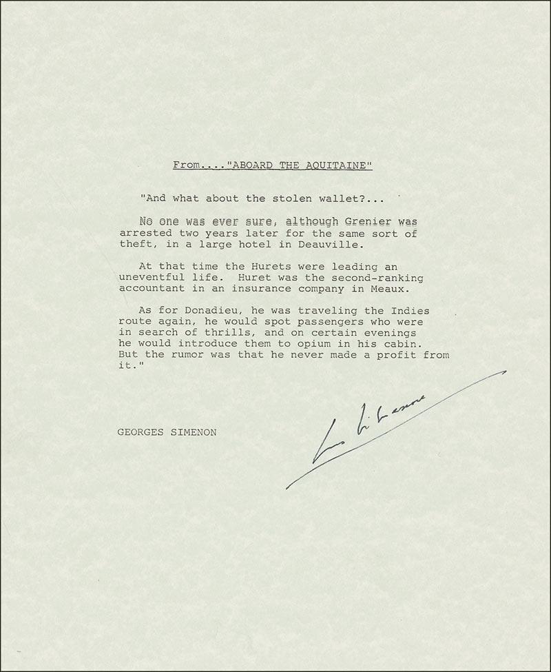 Souvenir typescript on an 8.5 x 10.25 light green sheet, an extract from ‘Aboard the Aquitaine,’ In part: “’And what about the stolen wallet?…No one was ever sure, although Genier was arrested two years later for the same sort of theft, in a large hotel in Deauville.’” Signed at at the conclusion in black felt tip “Georges Simenon.” In fine condition.