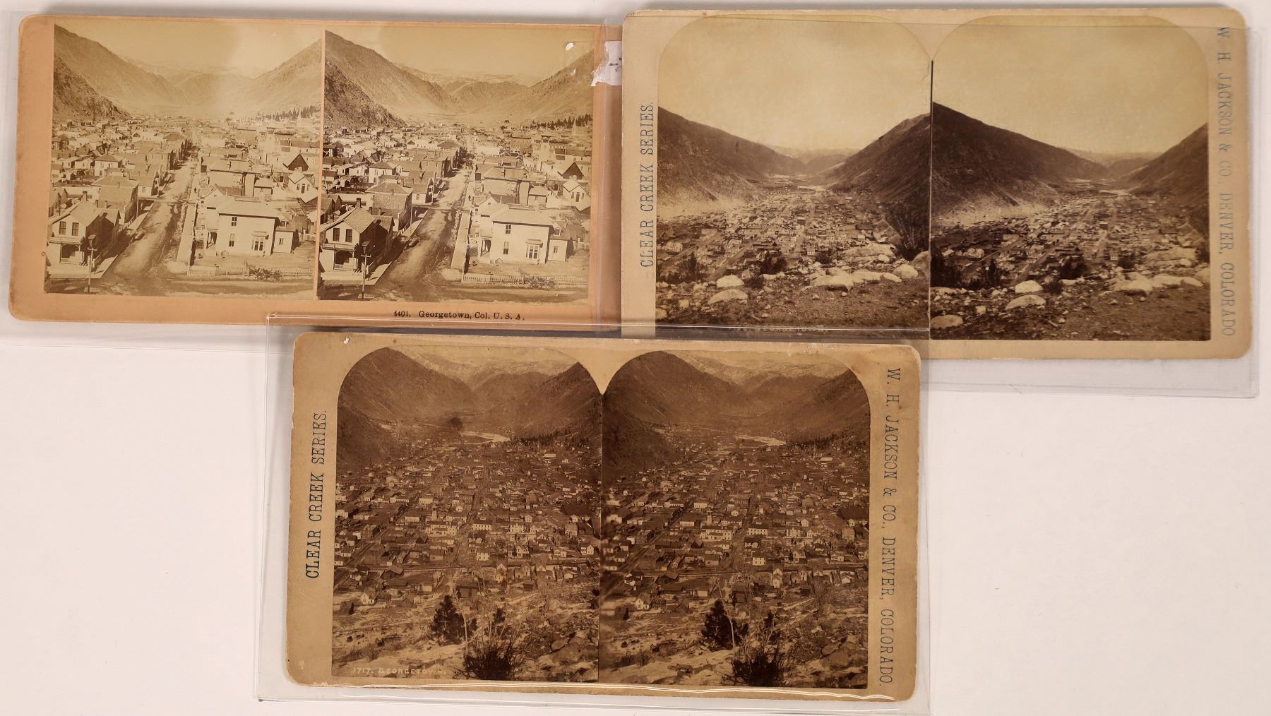 Lot of 3 different. 1) Kilburn Bros. No. 4401. Looking down a main street. Nice contrast. 2) W. H. Jackson, Denver. No. 1720. Clear Creek Series. Overview of the town in the valley. Information about Clear Creek Canon on the reverse. Chain & Hardy Trade-agents. 3) A different WH Jackson. No. 1717. Clear Creek Series. Bird's-eye view. Georgetown, Clear Creek Colorado