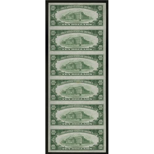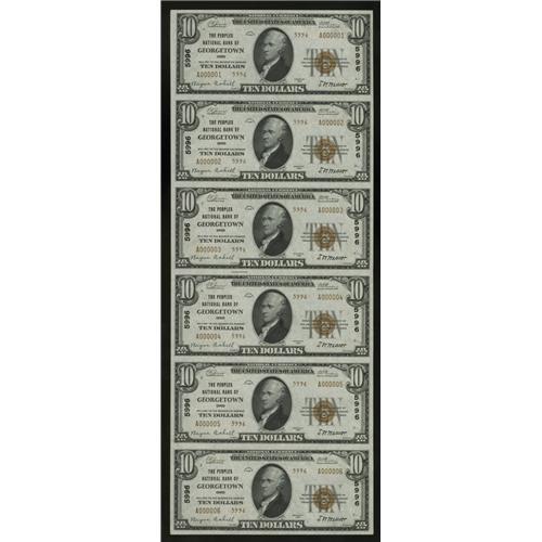 <B>Georgetown, OH</B></I>- $10 1929 Ty. 2 <B>The Peoples NB</B></I> Ch. # 5996 Uncut Sheet<BR>This is a lovely serial number 1-6 uncut sheet, with bold embossing and absolutely no folds or other distractions. <B>Gem Crisp Uncirculated.</B></I><BR><BR><b>Shipping:</b> Coin/Currency (<a target="_blank" href="http://www.heritageauctions.com/common/shipping.php">view shipping information</a>)