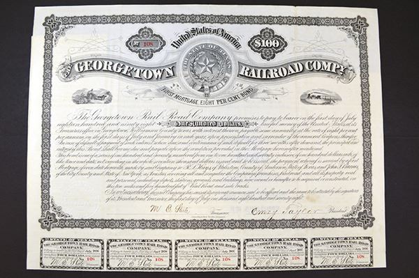 Texas. $100 8% Coupon Bond. Issued. 29 coupons remain. Nice large format bond. Very Fine+.