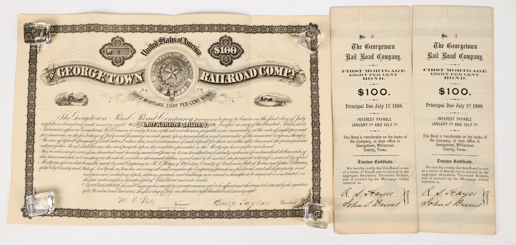 These are three bonds issued by the Georgetown Railway Company in 1878 for 8% interest. Three bonds with most coupons attached. The Lone Star is visible in the vignette. Please see photo for details.