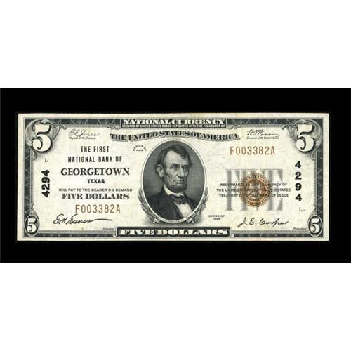 <B>Georgetown, TX</B></I> - $5 1929 Ty. 1 <B>The First NB</B></I> Ch. # 4294<BR> A bright and crisp <B>Very Fine-Extremely Fine</B></I> from a town whose notes are tightly held. E.H. Eanes as cashier and J.E. Cooper as president.<BR><BR><b>Shipping:</b> Coins & Currency (<a target="_blank" href="http://www.heritageauctions.com/common/shipping.php">view shipping information</a>)