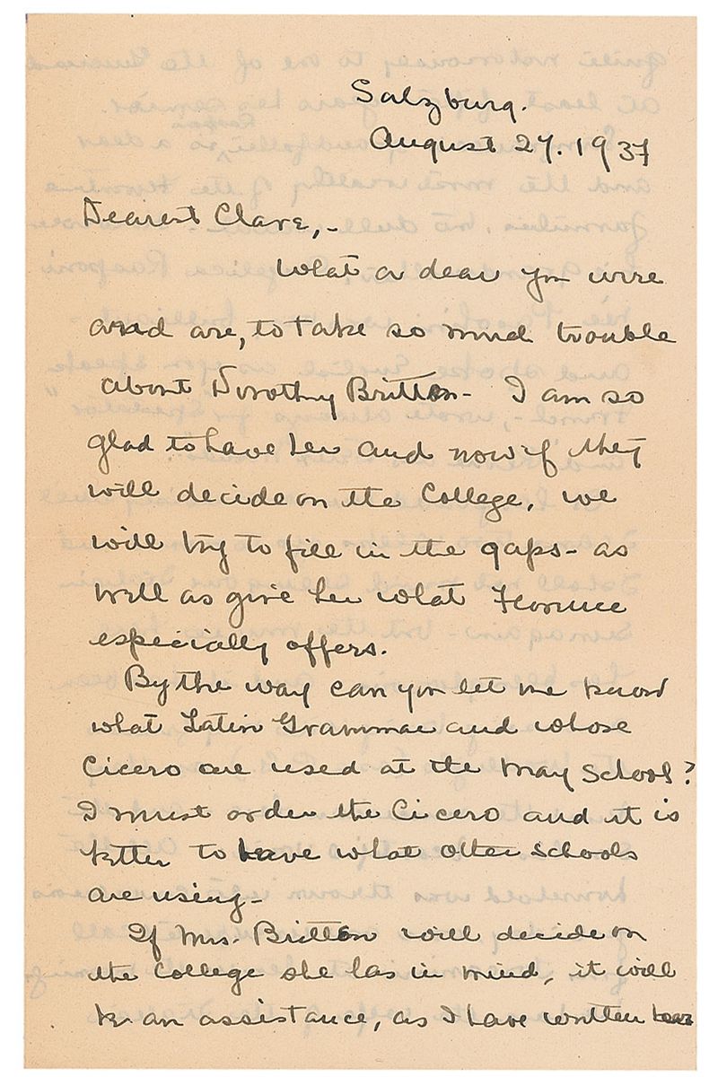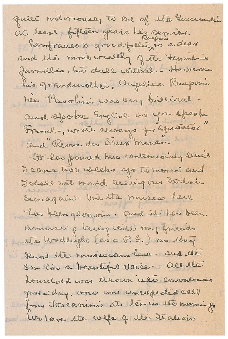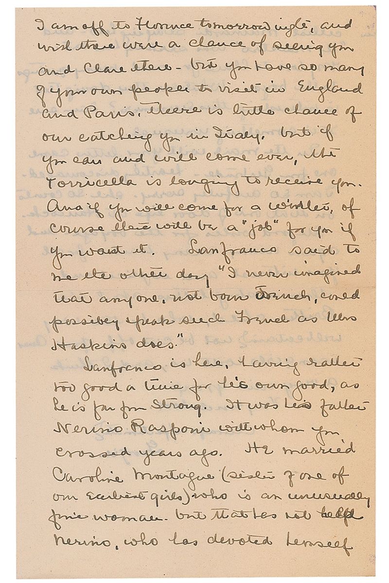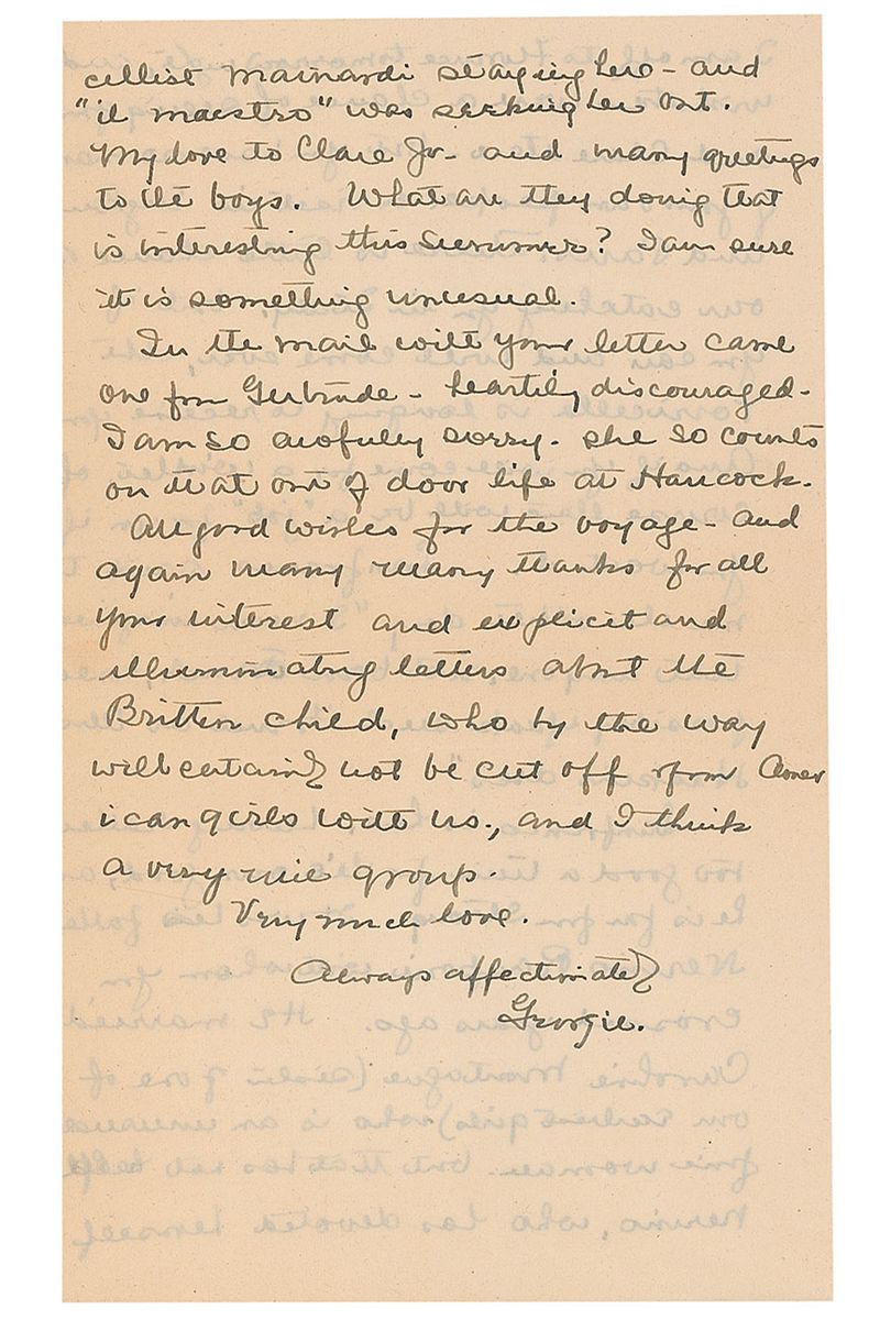 First class passenger aboard the Titanic (1896-1974) who survived the sinking with her aunt and uncle. ALS signed “Georgie,” three pages on two adjoining sheets, 5.25 x 8.5, August 27, 1937. Letter written while abroad to her aunt Clare Haskins, wife of noted Harvard professor Charles Haskins. In part: “I shall not mind seeing our Italian sun again—but the music here has been glorious…All the household was thrown into convusions yesterday, when an unexpected call from Toscani at ten in the morning. We have the wife of the Italian cellist Mainardi staying here—and ‘il maestro’ was seeking her out.” In fine condition. Ex. Brian Green Collection.