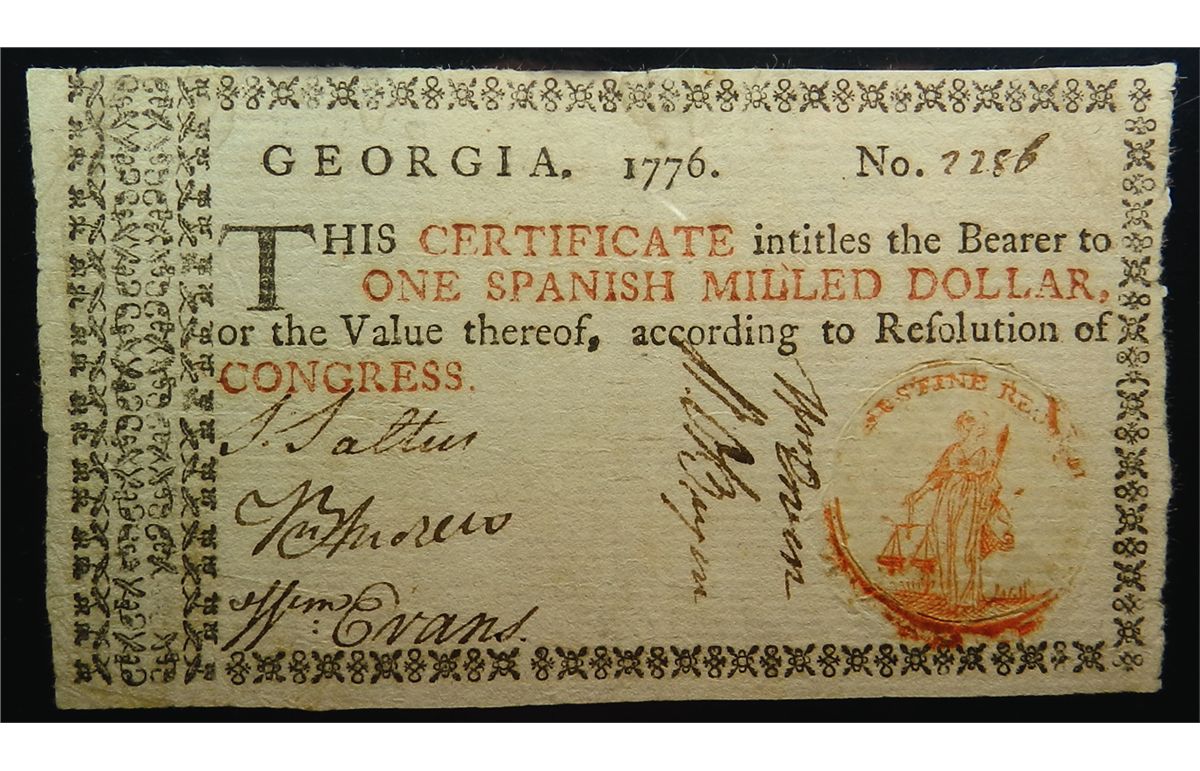 Georgia, $1.00, 1776. PCGS VF30. Pleasing example and nice for the grade.