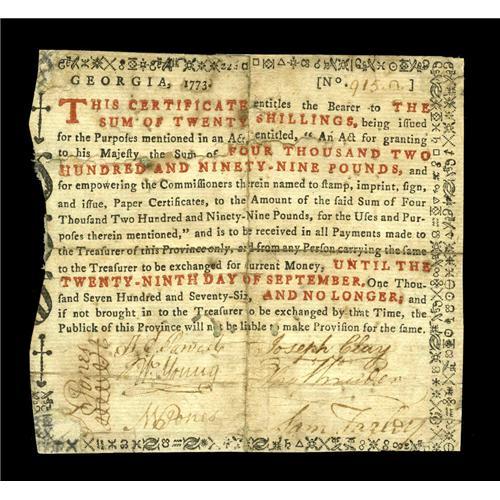 Georgia 1773 20s Very Fine Repaired. A very scarce one- Georgia 1773 20s Very Fine Repaired.