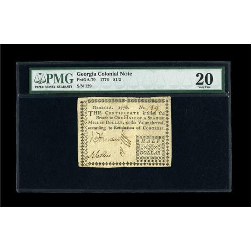 <B>Georgia 1776 $1/2 PMG Very Fine 20.</B></I> The signatures are strong on this pleasing low serial number small change note.<BR><BR><b>Shipping:</b> Coins & Currency (<a target="_blank" href="http://www.heritageauctions.com/common/shipping.php">view shipping information</a>)