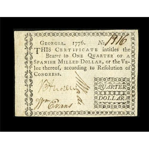 <B>Georgia 1776 $1/4 About New.</B></I> This is a bright, lightly handled note that exhibits prominent embossing, making it one of the best of this number that we have been able to offer. A tiny amount of ink erosion is noticed in the serial number.<BR><BR><b>Shipping:</b> Coins & Currency (<a target="_blank" href="http://www.heritageauctions.com/common/shipping.php">view shipping information</a>)