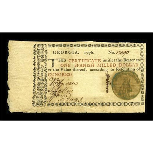 <B>Georgia 1776 $1 Very Fine.</B></I> This is the first of this number that we have had an opportunity to auction. The vignette on this rare note has darkened and there are stamp hinge tape repairs on the back. The note also has an extra large left selvage.<BR><BR><b>Shipping:</b> Coins & Currency (<a target="_blank" href="http://www.heritageauctions.com/common/shipping.php">view shipping information</a>)