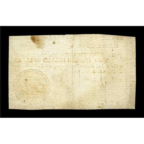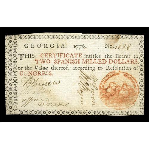 <B>Georgia 1776 $2 Extremely Fine.</B></I> Strong original embossing remains on this exceptional Georgia example. There is not a single split, tear, hole, or paper imperfection of any kind. The margins are close most of the way around, but it's more than made up for with the perfect paper quality and bright signature. High end Georgias have been very much in demand in the past two years--a trend which shows no sign abating.