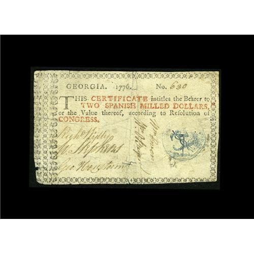 <B>Georgia 1776 $2 Fine-Very Fine.</B></I> The note has a fair amount of circulation and repaired splits on the left. All five signatures are strong, and the top of the blue seal has faded over time.