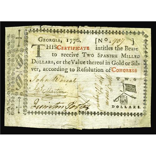 <B>Georgia 1776 $2 Fine.</B></I> We've net graded this scarce note, as it is extensively repaired along the right edge and the upper part of the left edge. The central portions of the note including the vignette, signatures and all the text, are untouched by these restorations, and the note grades substantially XF in these areas. The note has the appearance of a four-figure example, but will likely sell for about half that.
