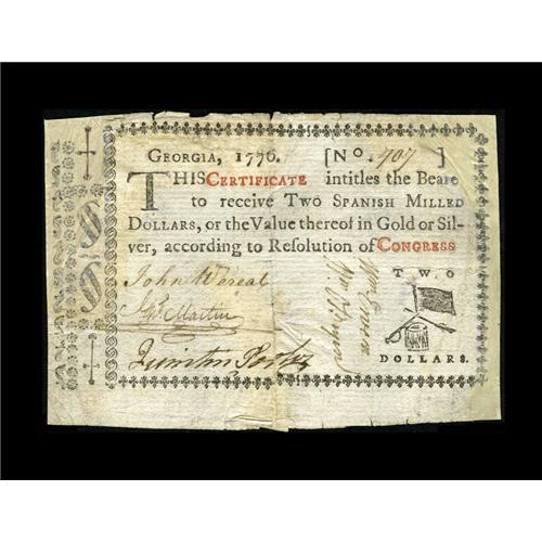 <B>Georgia 1776 $2 Very Fine.</B></I> We've net graded this scarce note, as it is extensively repaired along the right edge and the upper part of the left edge. The central portions of the note including the vignette, signatures and all the text, are untouched by these restorations, and the note grades substantially XF in these areas. The note has the appearance of a four-figure example, but will likely sell for about half that.<BR><BR><b>Shipping:</b> Coins & Currency (<a target="_blank" href="http://www.heritageauctions.com/common/shipping.php">view shipping information</a>)