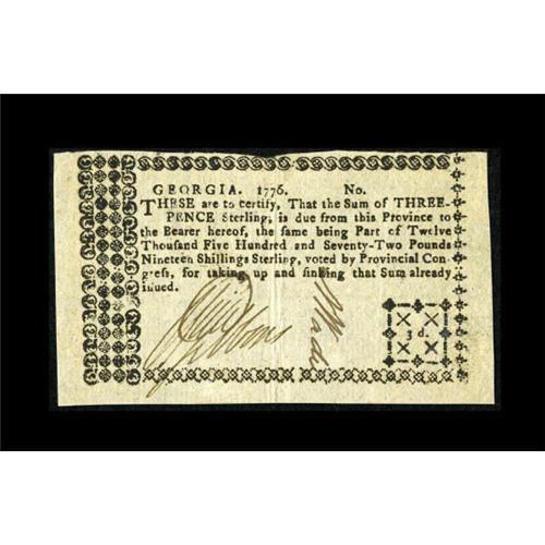<B>Georgia 1776 3d Extremely Fine.</B></I> An exceptional example of this issue. It is basically an Uncirculated note save for a centerfold and a bit of handling, but it shows no traces of actual circulation. It is 100% fresh and clean. The extremely weak paper of this type has caused virtually all survivors of this issue to have splits, holes, and all manner of repairs. This piece has avoided all of that, and is as attractive as the day it was printed.<BR><BR><b>Shipping:</b> Coins & Currency (<a target="_blank" href="http://www.heritageauctions.com/common/shipping.php">view shipping information</a>)