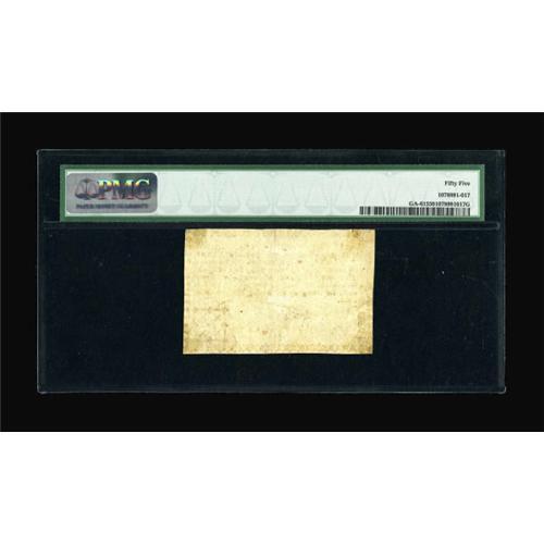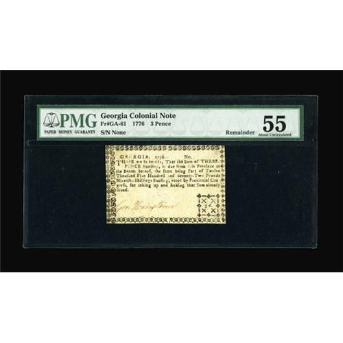 <B>Georgia 1776 3d PMG About Uncirculated 55.</B></I> PMG has commented "Remainder," although in all likelihood, this is an issued note with one of the signatures faded. The lower denomination notes of this issue are generally unnumbered. About Uncirculated 55 is a very high grade for this issue. <BR><BR><b>Shipping:</b> Coins & Currency (<a target="_blank" href="http://www.heritageauctions.com/common/shipping.php">view shipping information</a>)