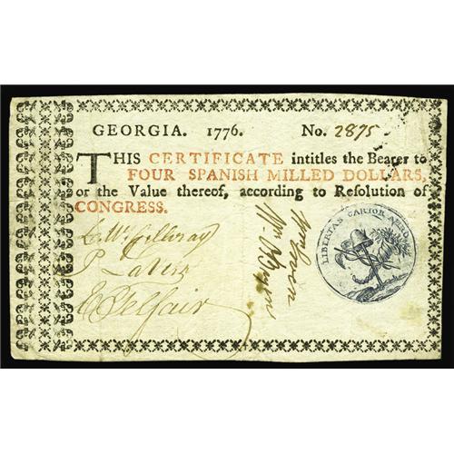 <B>Georgia 1776 $4 Extremely Fine.</B></I> A spectacular piece of Georgia currency, with a razor-sharp blue Caduceus and Liberty Cap seal. The seal is beautifully embossed through to the back of the note, as is the text. All five signatures are bold, and the note has spectacular eye appeal. High quality Georgia notes have been avidly pursued as of late, and this piece is one of the most handsome in this wonderful collection.