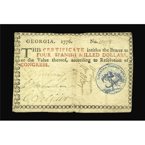 <B>Georgia 1776 $4 Very Fine-Extremely Fine.</B></I> A moderately circulated note which is fresh and bright with bright blue seal that is impressed through to the back. There are some minor internal splits but nothing that is too distracting.