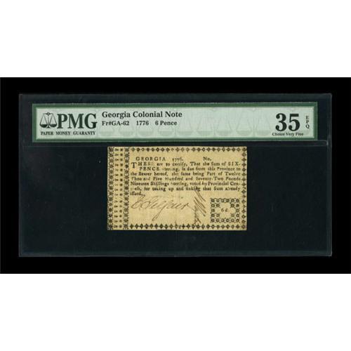 <B>Georgia 1776 6d PMG Choice Very Fine 35 EPQ.</B></I> A well-margined, well-signed and problem-free example of a low denomination note that is seldom seen.<BR><BR><b>Shipping:</b> Coins & Currency (<a target="_blank" href="http://www.heritageauctions.com/common/shipping.php">view shipping information</a>)