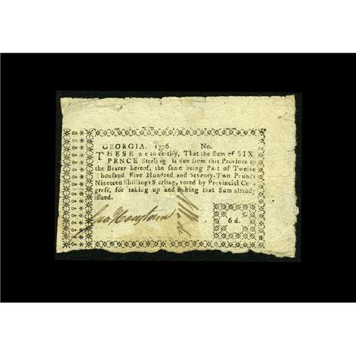 <B>Georgia 1776 6d Very Fine-Extremely Fine.</B></I> A remarkably well margined, problem-free, utterly unrestored example of this scarce issue.