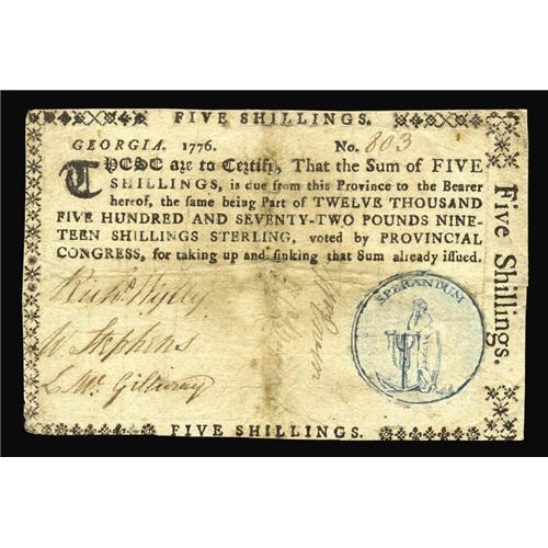 <B>Georgia 1776 - Blue seal with SPERANDUM 5s Choice Very Fine.</B></I> An extremely rare and underrated note, and the only colored seal note from this issue. This is the first example of this note that HCAA has handled and most advanced Georgia collections are missing this piece. Catalog prices, although they are nearly double what the other notes of this issue are priced at, do not begin to reflect the true value of this piece. The note has four stamp hinges on its blank back that help support minor splits, but it is otherwise unrestored, well-centered and problem-free. A difficult note to estimate, but we would not be at all surprised with a realization approaching $3,000.