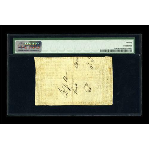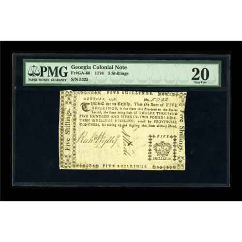 <B>Georgia 1776 - Crown (two border varieties) 5s PMG Very Fine 20.</B></I> This is a very nice example of this very scarce Crown variety. We have only sold three others in recent years with the finest of those a similarly graded example that sold for $1840 a few months ago. This note faces up wonderfully and will make any Georgia collector proud to display it to his friends.<BR><BR><b>Shipping:</b> Coins & Currency (<a target="_blank" href="http://www.heritageauctions.com/common/shipping.php">view shipping information</a>)