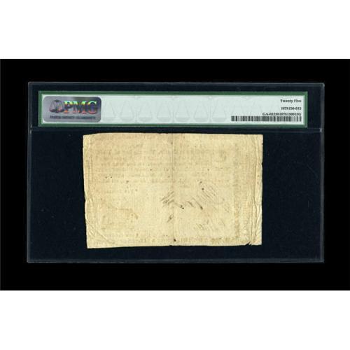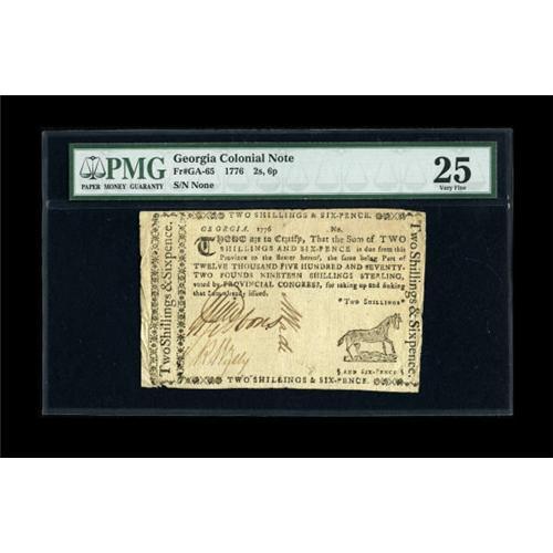 <B>Georgia 1776 - Denomination on both right and left sides 2s/6d PMG Very Fine 25.</B></I> This is the variety with the denomination at the left and the ornamentation at the right. The note has seen a light amount of circulation, and it has remained remarkably problem-free with a bold vignette, strong color, and no distractions save for a few holes. An outstanding example of a very scarce note.<BR><BR><b>Shipping:</b> Coins & Currency (<a target="_blank" href="http://www.heritageauctions.com/common/shipping.php">view shipping information</a>)