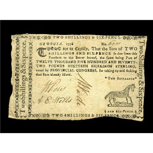 <B>Georgia 1776 Sterling Denomination Issue 2s6d Very Fine.</B></I> This is the variety with the denomination at the left and the ornamentation at the right. The note has seen a fair amount of circulation, hence the <B>Very Fine</B></I> grade, but it has remained remarkably problem-free with a bold vignette, strong color and no distractions. An outstanding example of a very scarce note. One of the signers is William Few, who went on to sign the United States Constitution eleven years after signing this note. One of the very nicest examples that we've examined of this note and denomination.