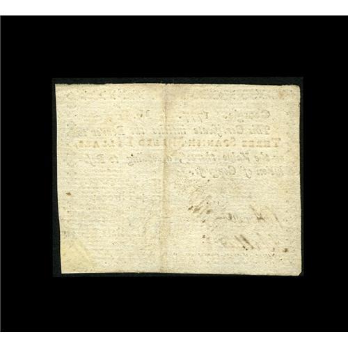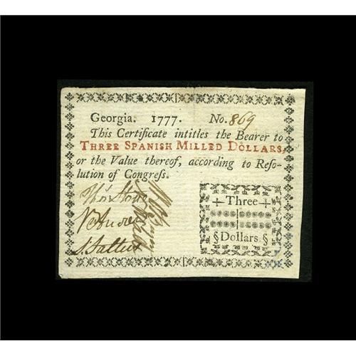 <B>Georgia 1777 $3 About New.</B></I> A well signed and bright example from this highly desirable colony which has a single centerfold and good embossing. There are a couple of minor repairs but which have been skillfully done and which do not greatly hinder the note's eye appeal.