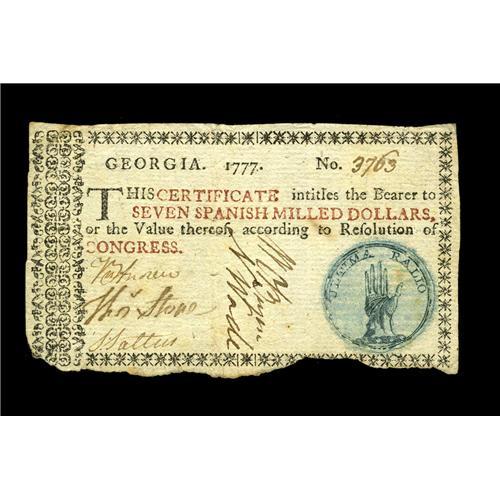 <B>Georgia 1777 $7 Extremely Fine.</B></I> The bottom margin is irregular and intrudes on the border at one point. Save for that, this lightly circulated Georgia note is virtually perfect. The blue-green vignette of an outstretched hand is as sharp as any example that we have had the pleasure of handling, and the overall appearance of this piece is quite special.
