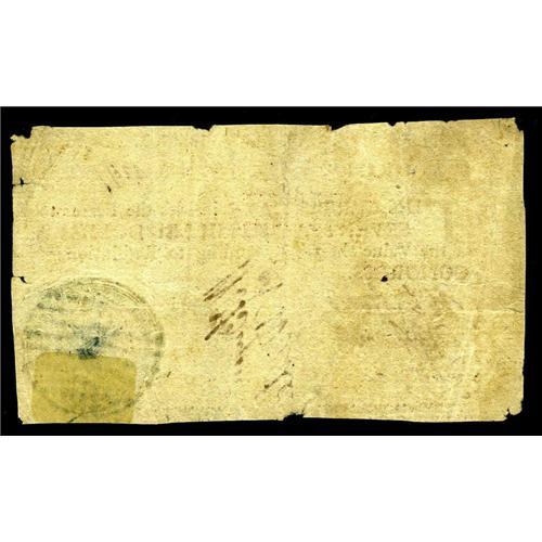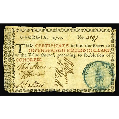 <B>Georgia 1777 $7 Very Fine-Extremely Fine.</B></I> There are some tiny edge splits and damage at the corner tips, but the note is wholly free of repairs and restorations. The blue hand vignette and every letter of the Latin motto is deeply colored and perfect. One of the nicest examples we've seen of this very scarce note.
