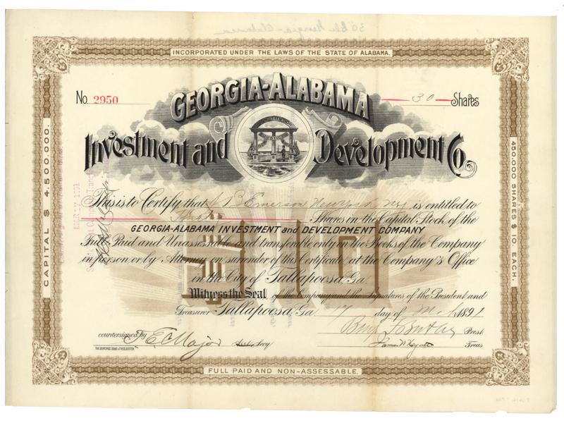 1891, Georgia. Stock certificate for 5 shares. Brown/Black. Small vignette at top center of the Georgia State Seal. Signed as President by Benjamin Butler. BUTLER, BENJAMIN F. (1818-1893). Union general in the Civil War; Presidential candidate; Massachusetts; Governor; Congressman. As one of the few democrats supporting the Union, Butler was quickly appointed major-general of volunteers by Lincoln when the war broke out, and so began one of the most astounding careers of the war. Until Grant took control, Butler was as much in the news as anyone but Lincoln, and fully expected to receive the Unionist presidential nomination in 1864. From the record, it is very clear that he expected the war to advance his own political fortunes, and the financial fortunes of his family and friends. During the war, he moved in an atmosphere of constant controversy, which continually widened from local quarrels such as that with the governor of Massachusetts, to quarrels international in scope such as the reaction of foreign governments to his confiscation of money and property of European citizens while he was military governor of New Orleans. It has been said that the many of actions he performed were exceedingly clever, almost to the point of being brilliant; he was certainly the most innovative of the commanders on either side of the conflict. One of his first acts was to lead his command to the rescue of blockaded Washington in April of 1861 by occupying Baltimore, and securing the railroad line between Baltimore and Washington. Nicknamed "Beast" by the Confederates due to the harsh measures he took in administering New Orleans (May-December 1862) after it fell to the Union, he was the only military or political figure on either side of the conflict to be branded an "outlaw" by the enemy forces and have a price put on his head. While Butler had numerous military successes during the war, he also had several spectacular and well-publicized failures which led Lincoln to dismiss him in January 1865. After the war Butler entered politics, his most notable achievement in this arena being the floor manager and chief prosecutor during President Andrew Johnson's impeachment trial in the Senate. Uncancelled and extremely fine.
