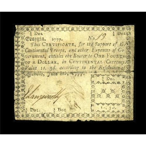 <B>Georgia June 8, 1777 $1/4 Fine.</B></I> The paper is crisp and there are splits along the lateral center fold. This note is blessed with serial number 13. <BR><BR><b>Shipping:</b> Coins & Currency (<a target="_blank" href="http://www.heritageauctions.com/common/shipping.php">view shipping information</a>)