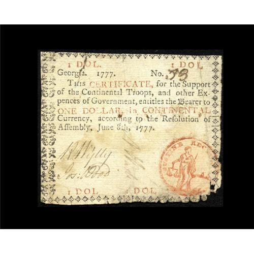 <B>Georgia June 8, 1777 $1 Fine.</B></I> This is a popular and attractive issue, with the internal paper surfaces grading Very Fine, however the lower right corner has obviously seen better days.<BR><BR><b>Shipping:</b> Coins & Currency (<a target="_blank" href="http://www.heritageauctions.com/common/shipping.php">view shipping information</a>)