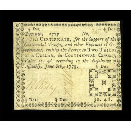 <B>Georgia June 8, 1777 $2/3 Very Fine.</B></I> We see about one of these a year. The current example is adorned with serial number 26 and a small repair. <BR><BR><b>Shipping:</b> Coins & Currency (<a target="_blank" href="http://www.heritageauctions.com/common/shipping.php">view shipping information</a>)