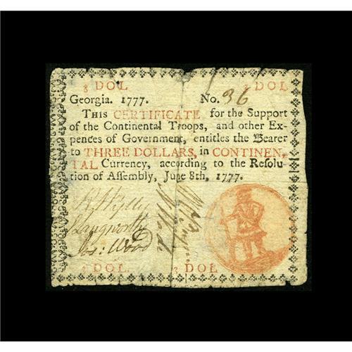 <B>Georgia June 8, 1777 $3 Very Fine.</B></I> This Georgia note has bold signatures, bright orange seal and a low serial number 36. There are a couple of small edge chinks and some minor repairs which are visible primarily from the back. This is still a more elusive issue which should garner some interest from collectors.