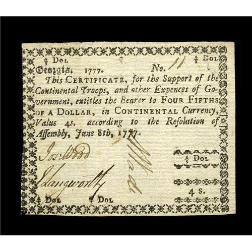 Georgia June 8, 1777 $4/5 Extremely Fine-About New. The Georgia June 8, 1777 $4/5 Extremely Fine-Abo