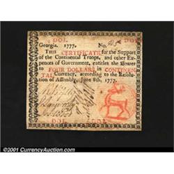 Georgia June 8, 1777 $4 Extremely Fine.<p>Well margined and very attractive, with its only visual detraction being extremely minor aging of the top and bottom edges, apparently caused by previous mounting. This is the scarcer variety with the black "in" in the fourth line. It's low serial-number 25. Important notice: We expect to be auctioning lots at the rate of 200-250 per hour. Sometimes eBay Premier live bid software cannot keep up with that pace, so we strongly recommend that you place a realistic proxy bid now as insurance to avoid disappointment. Also please note that all Heritage/CAA lots purchased through eBay Premier carry a 20% Buyer's Premium.
